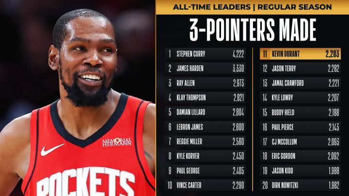 凭借这样的表现,杜兰特三分总数超越特里升至历史第11名,同时即将反超历史第十卡特。